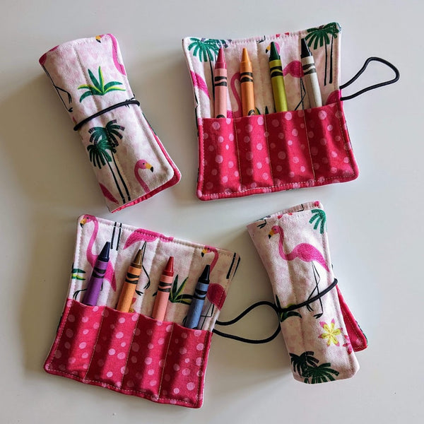 Each mini crayon roll measures approximately 4.5" square and has a stretchy elastic attached for closure.