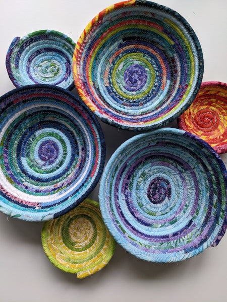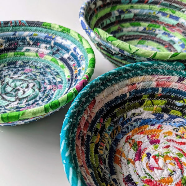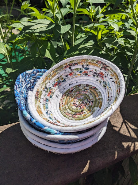 These bowls are perfect for holding sewing notions, jewelry, accessories, and other small items. These bowls are also perfect for storing loose parts or Montessori toys. Made with cotton clothesline and raw edge fabric strips, and sewn with coordinating threads.