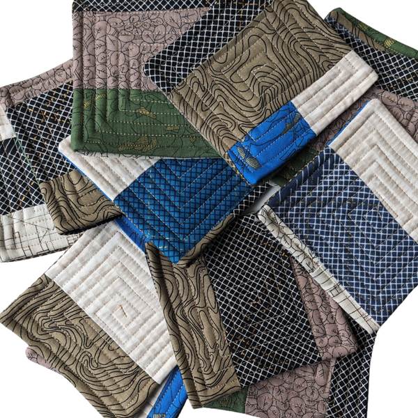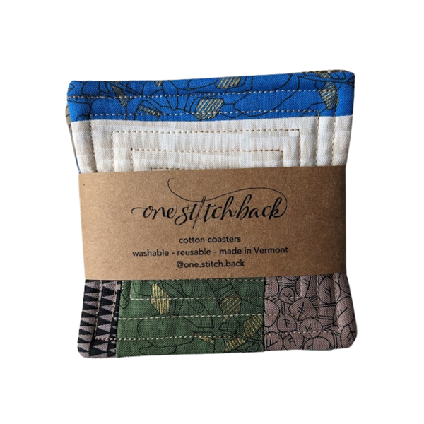 These CF Scraps Quilted Coasters are made using various prints designed by our favorite designer, Carolyn Friedlander, featuring architectural-inspired patterns and motifs reminiscent of classic “dad’s tie” designs. Each coaster measures approximately 4" x 4" and is crafted with pre-washed cotton fabric, cotton thread, and soft cotton batting for a crisp, handcrafted finish, and because each set is made from assorted scraps, every coaster and set will be a little different—see the second photo for examples of what you may receive. They’re durable, machine-washable, and dryer-friendly on low heat—just toss them in with your kitchen towels and they’re good as new. This listing includes a set of four coasters.