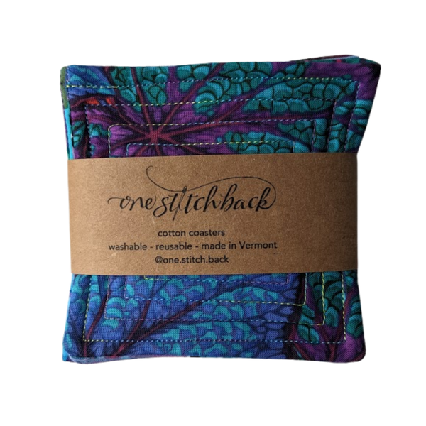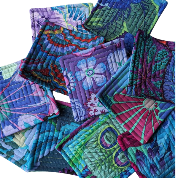 Brighten up your home with our Flower Garden quilted coasters—pretty, practical, and ready for everyday spills! These sturdy little squares are fully machine-washable and dryer-friendly, so just toss them in with your kitchen towels and they’ll pop out looking brand new. Each coaster measures approximately 4" square, and every set features a fun mix of fabrics—see the second photo for a peek at the variety you might receive!