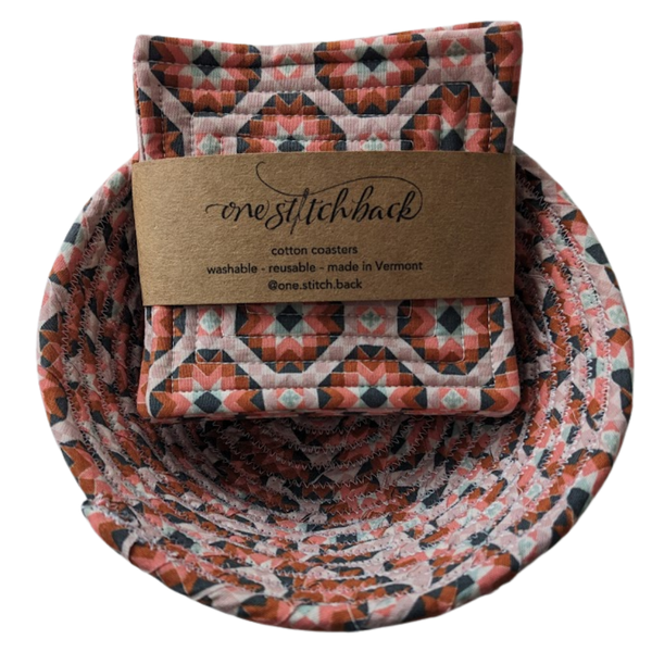 Each coaster measures approximately 4" x 4" and is crafted from pre-washed cotton fabric, cotton thread, and soft cotton batting for a cozy, durable finish. They’re made for everyday living—when it’s time for a refresh, just toss them in the washing machine with your kitchen towels and tumble dry on low.