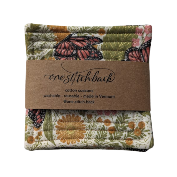 Add a splash of garden whimsy to your table with these delightful Monarch butterfly quilted coasters! Designed to handle daily use with ease, they’re as durable as they are adorable. When it’s time for a refresh, just toss them in the washing machine with your kitchen towels and tumble dry on low—easy peasy! Each coaster measures about 4" square and is lovingly made from pre-washed cotton fabrics, cotton thread, and soft cotton batting for a cozy, quilted feel. This set of 4 bright coasters is perfect for protecting your surfaces while brightening up any coffee break or hangout.