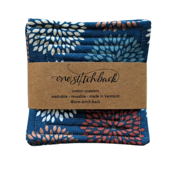 Each coaster is about 4" square, crafted from pre-washed cotton fabrics, cotton thread, and soft cotton batting.