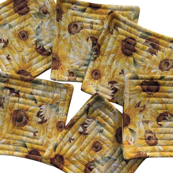 With warm yellows, tan and brown, these sunflower quilted coasters add a country touch to any table in your home. Our sunflower fabric is designed by Sarah Bowditch of Michigan Threads Headbands.